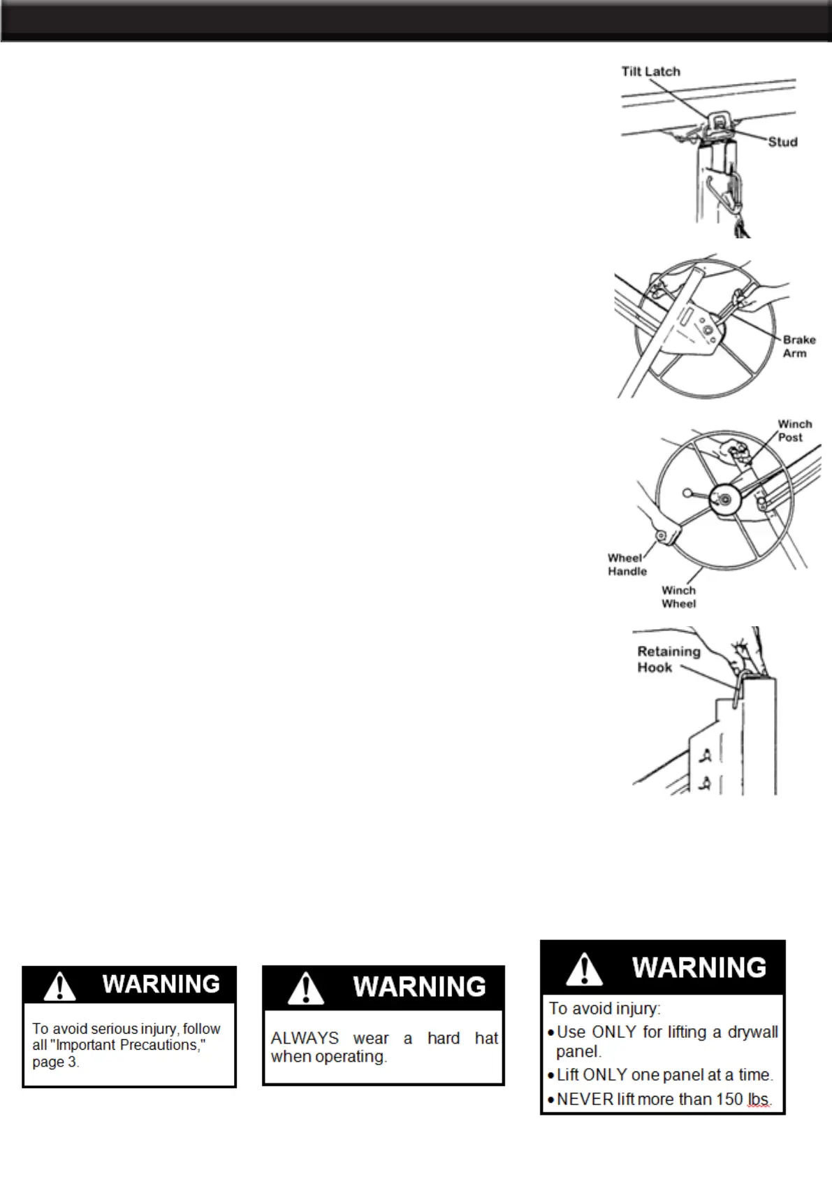 the winch by grasping the wheel handle as you carefully raise the brake arm