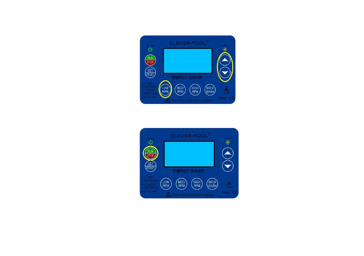 Press the RUN/STOP button to put it into run mode, this will start the pump. When the chlorinator timer turns off, the CLEVER-