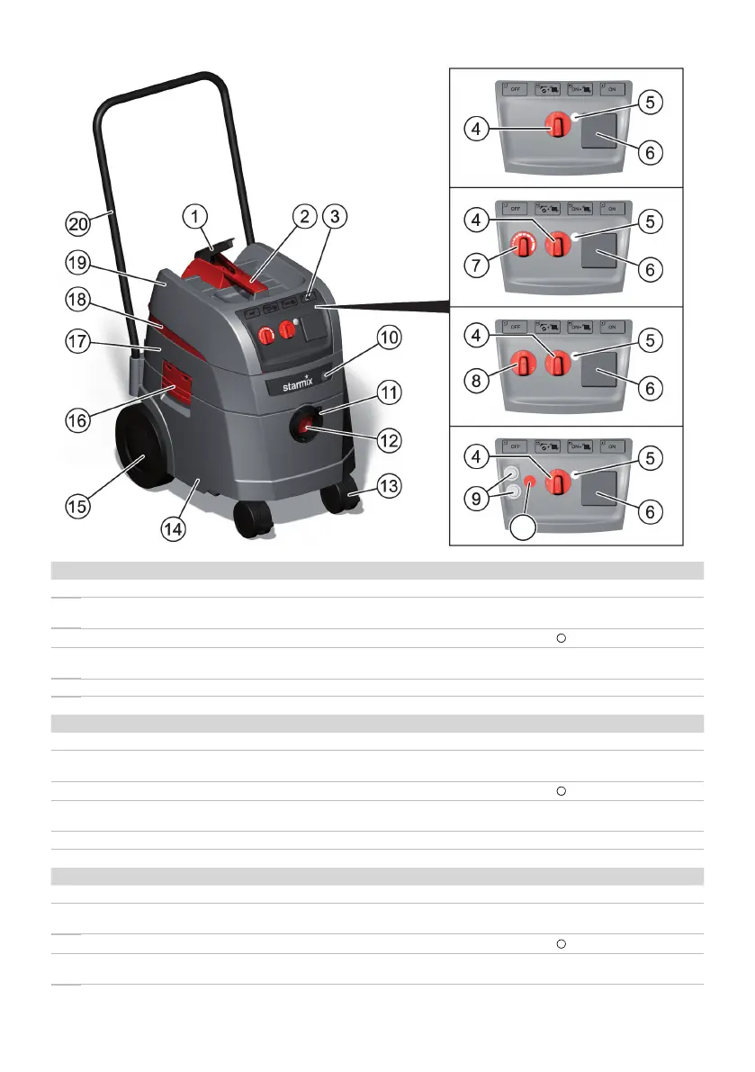 ⑤ Fill level indicator * ⑪ Vacuum spigot ⑰ Motor housing