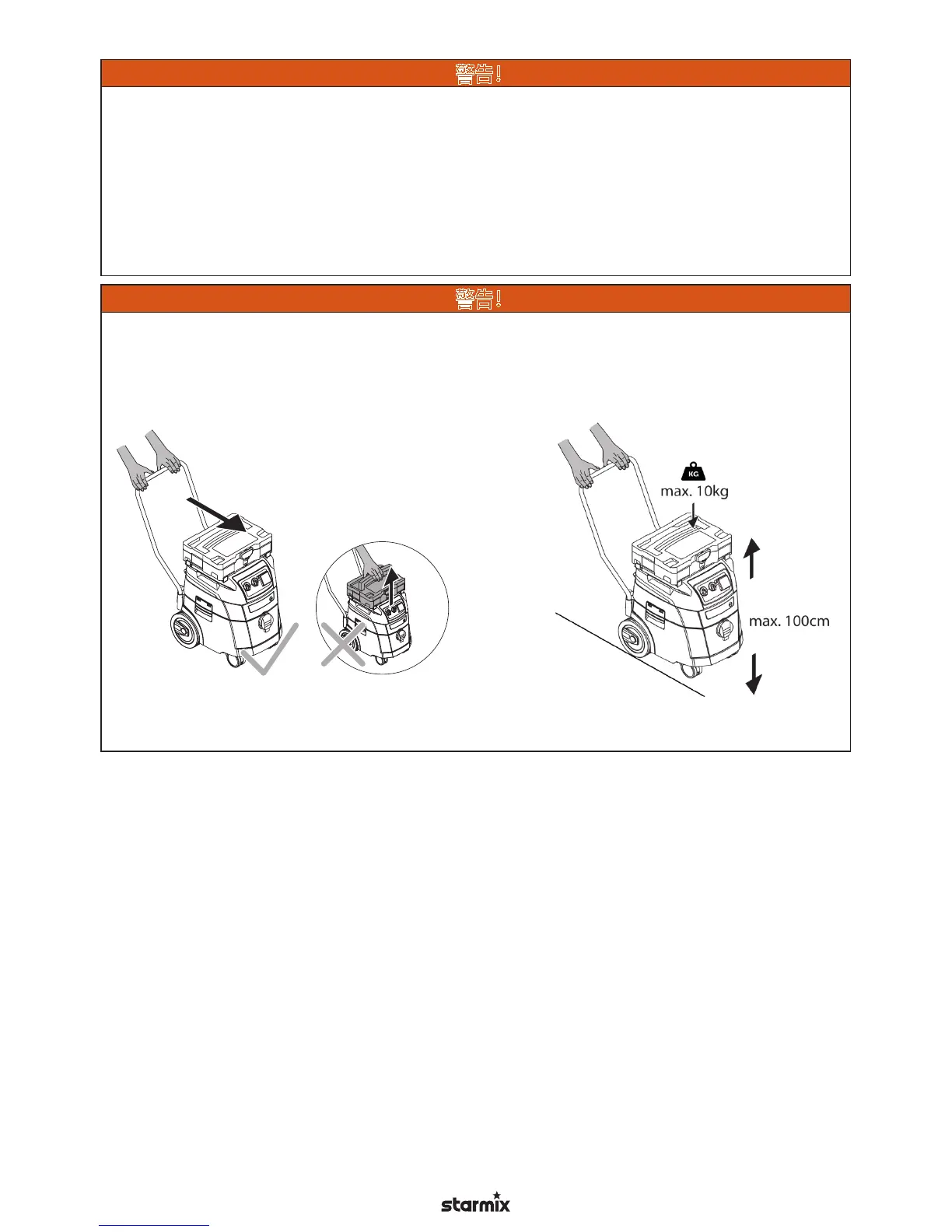 请勿通过握住安装的工具箱来提起真空吸尘器。