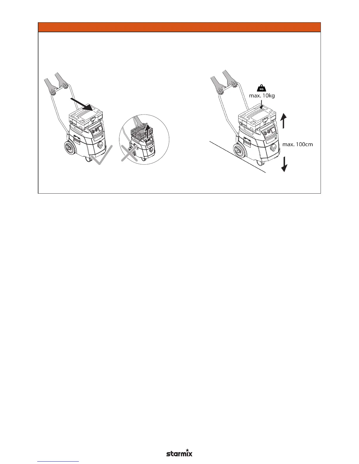 Løft ikke støvsugeren op ved at tage fat i den monterede værktøjskasse.