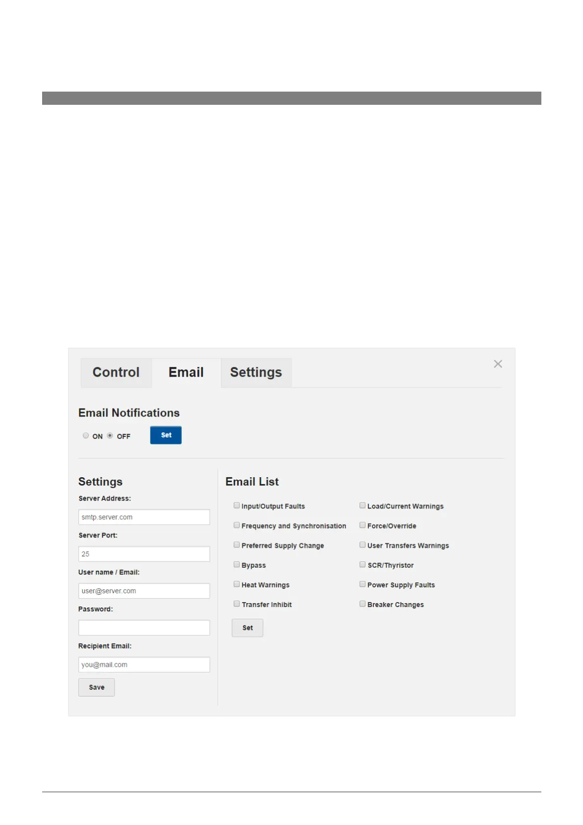 Email tab allows you to turn on the email notification service. When a certain event occurs the unit will