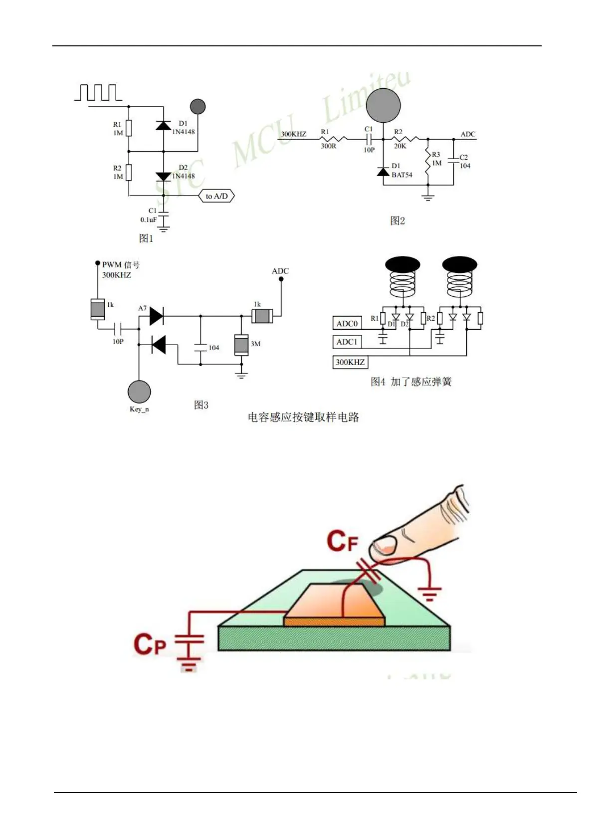 is the finger capacitance, they are connected in parallel and connected with C1 to divide the input 300KHZ square wave.