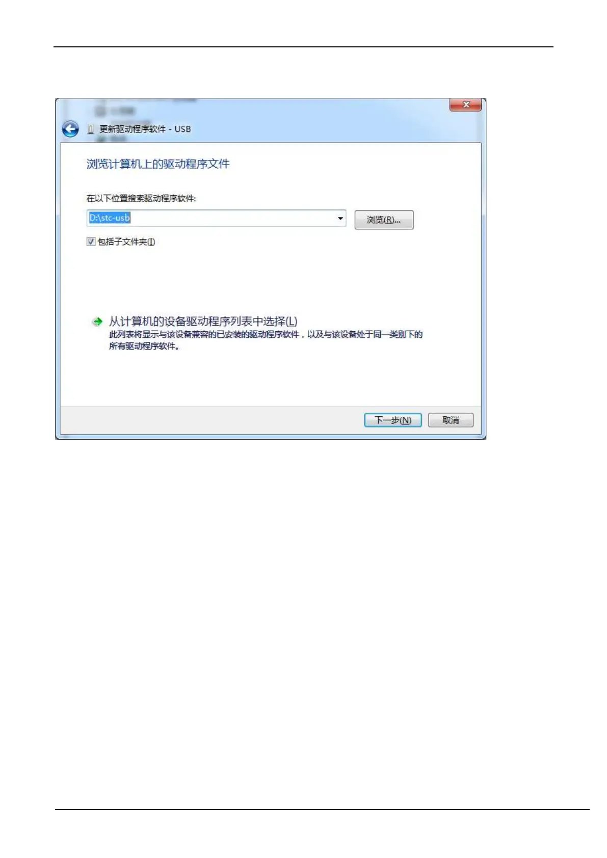Click the "Browse" button in the dialog below to find the directory of the previous STC-USB driver stored (for example: