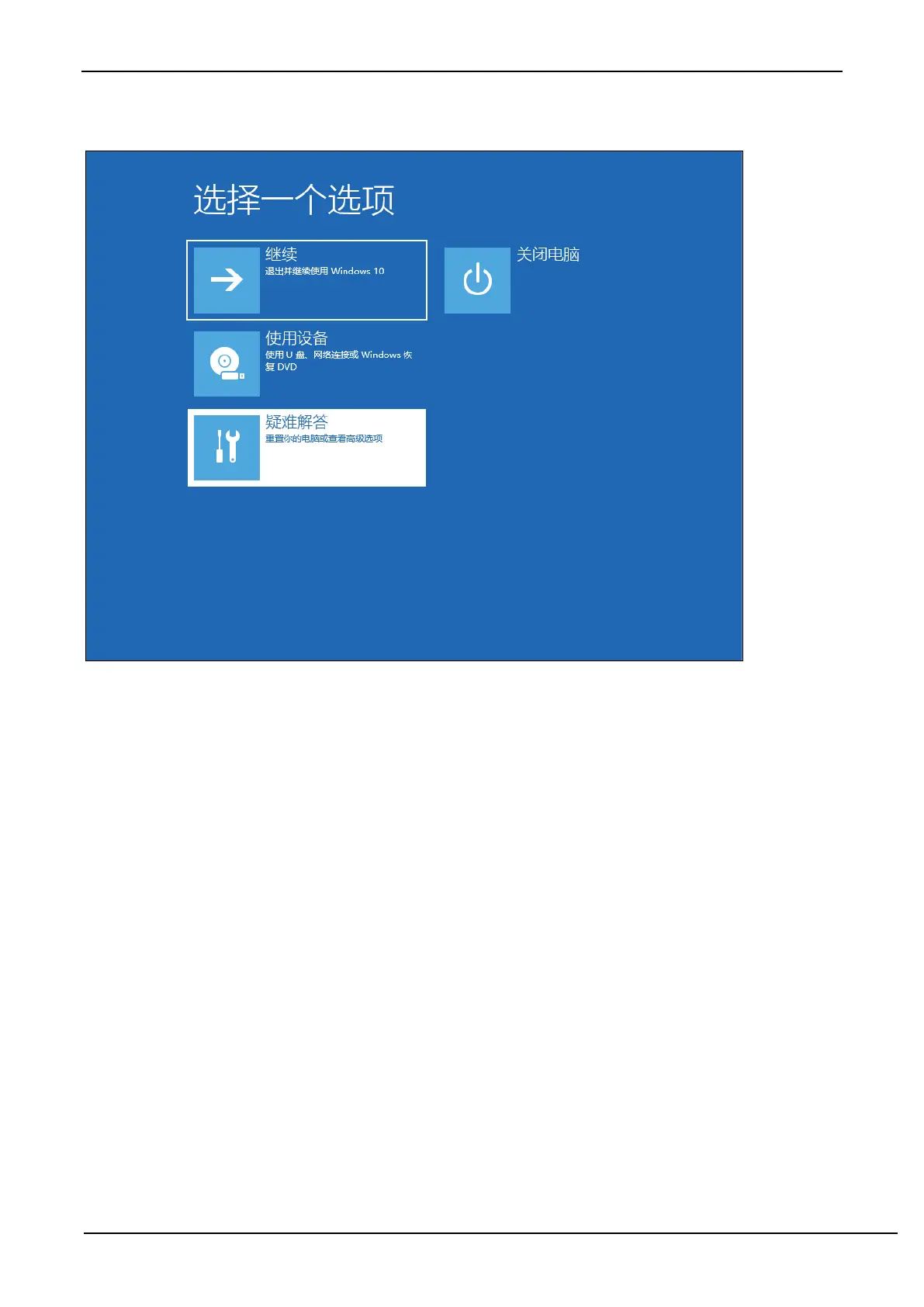 Before the computer restarts, the system will enter the following boot menu firstly and select the "Troubleshooting"