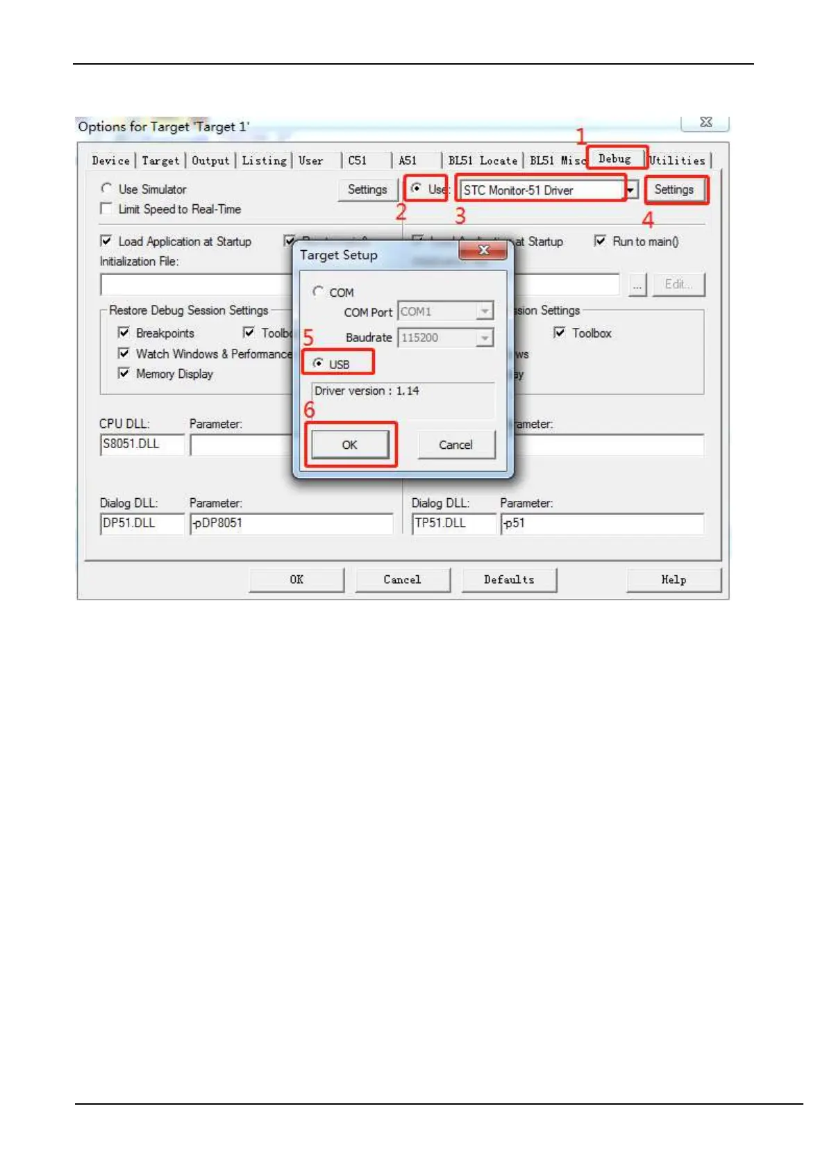 In the project options, follow the steps shown in the figure below to set the USB emulation.