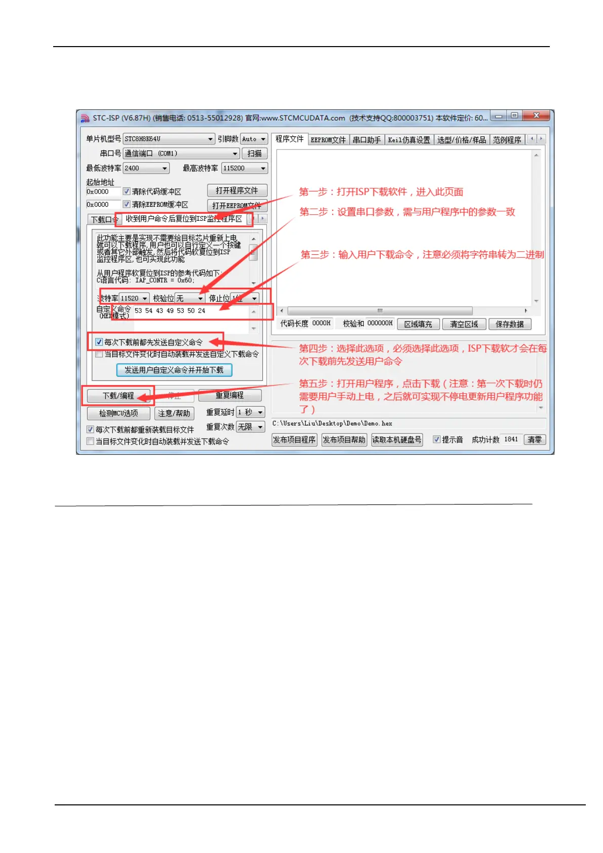The following assumes that the user download command is the string "STCISP$", the serial port is set to 115200