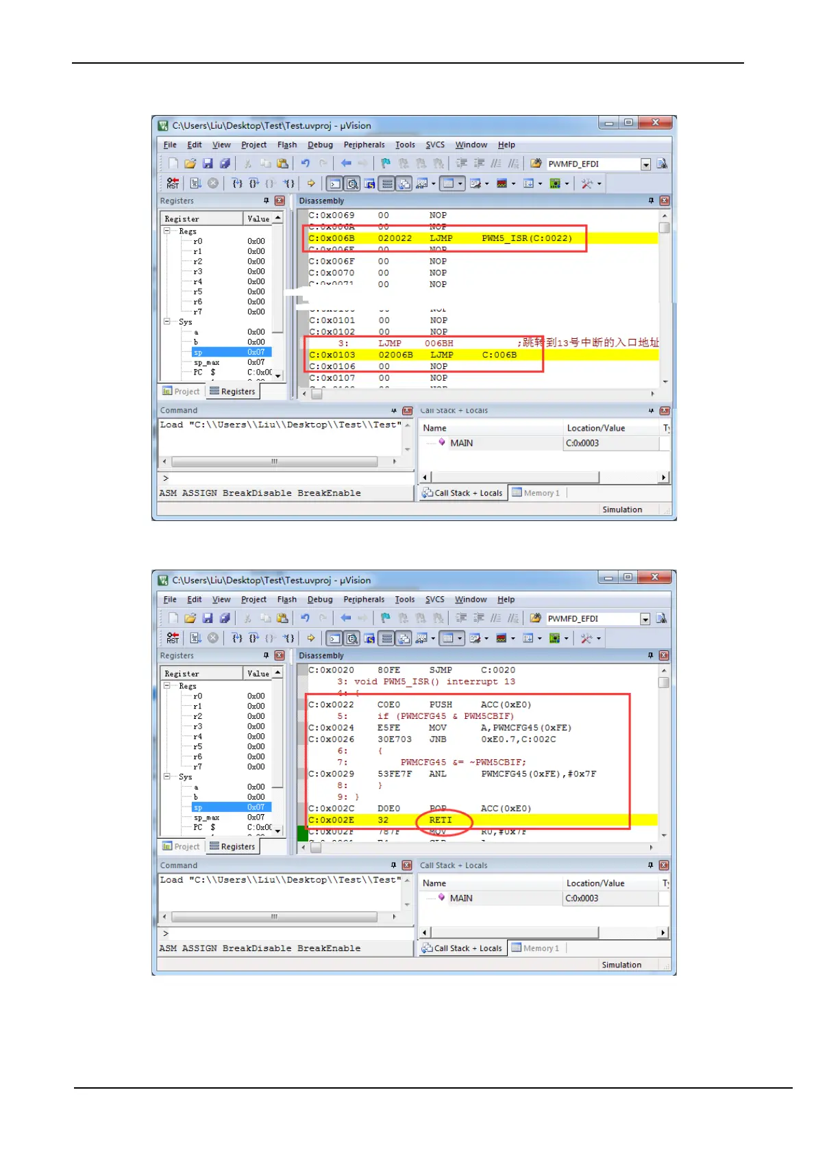 006BH", and then execute "LJMP PWM5_ISR" at 006BH to jump to the real interrupt service routine, as shown in the
