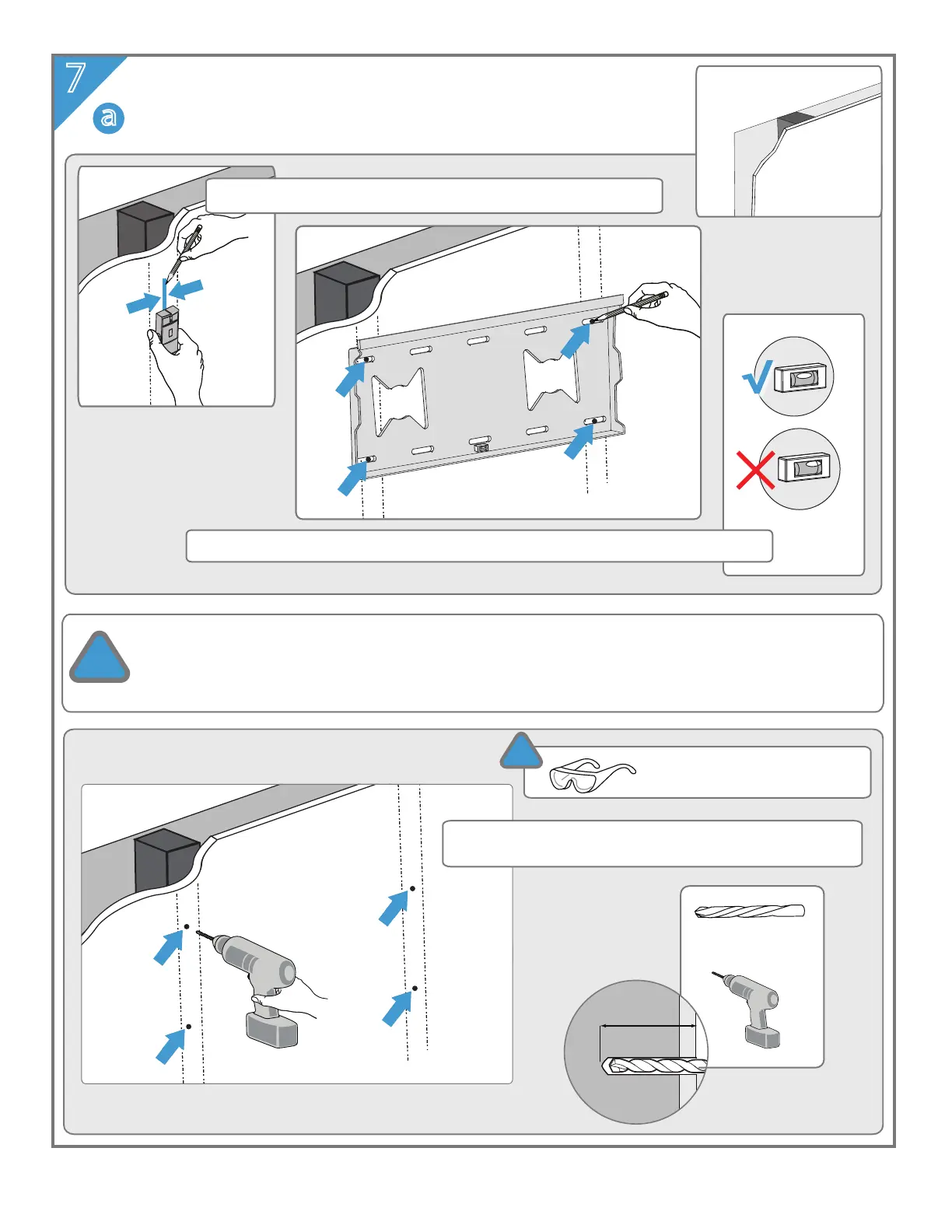 Avoid drilling near electrical wiring and water pipes. Mount must be attached to a weight bearing wall
