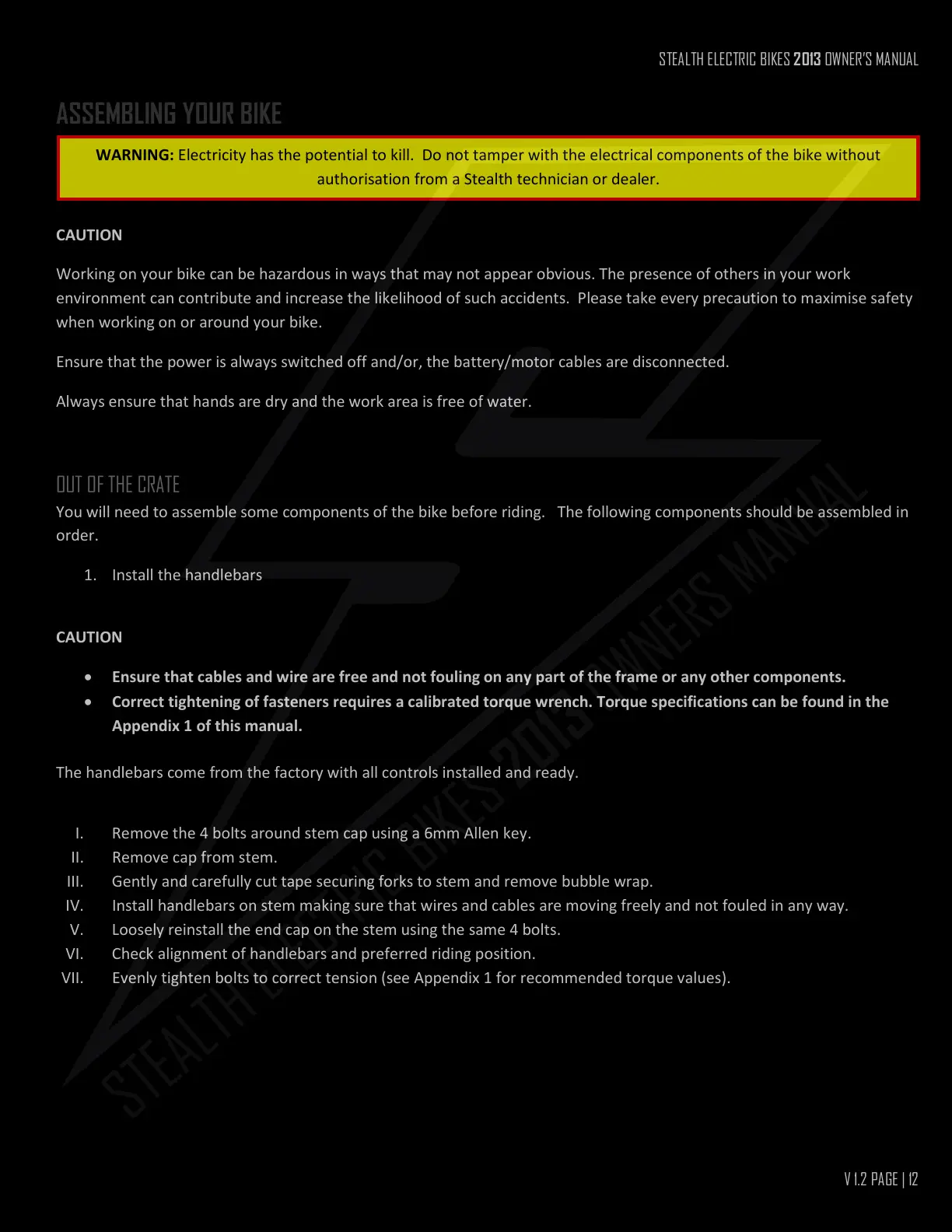 STEALTH ELECTRIC BIKES 2013 OWNER’S MANUAL