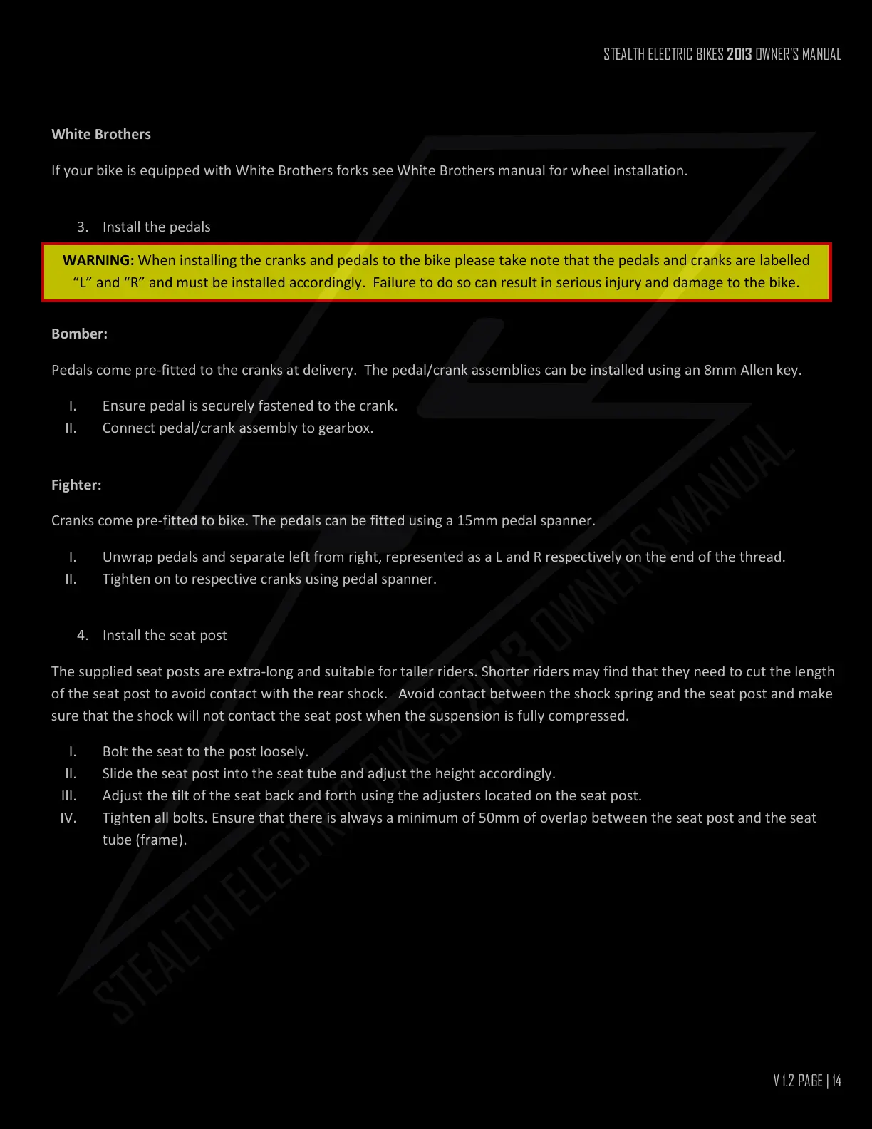 STEALTH ELECTRIC BIKES 2013 OWNER’S MANUAL
