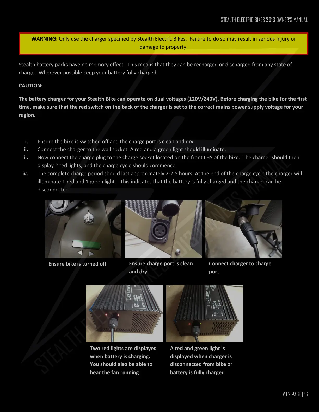 WARNING: Only use the charger specified by Stealth Electric Bikes. Failure to do so may result in serious injury or