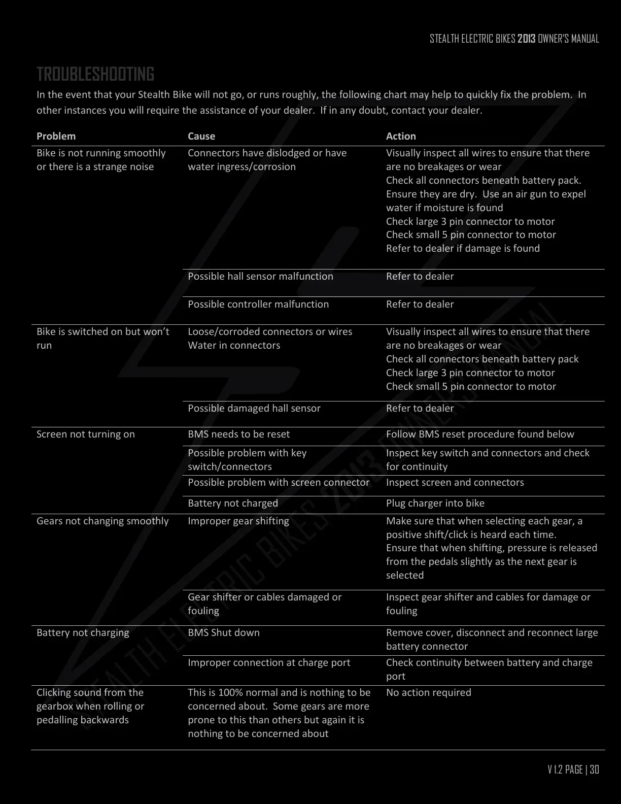 In the event that your Stealth Bike will not go, or runs roughly, the following chart may help to quickly fix the problem. In