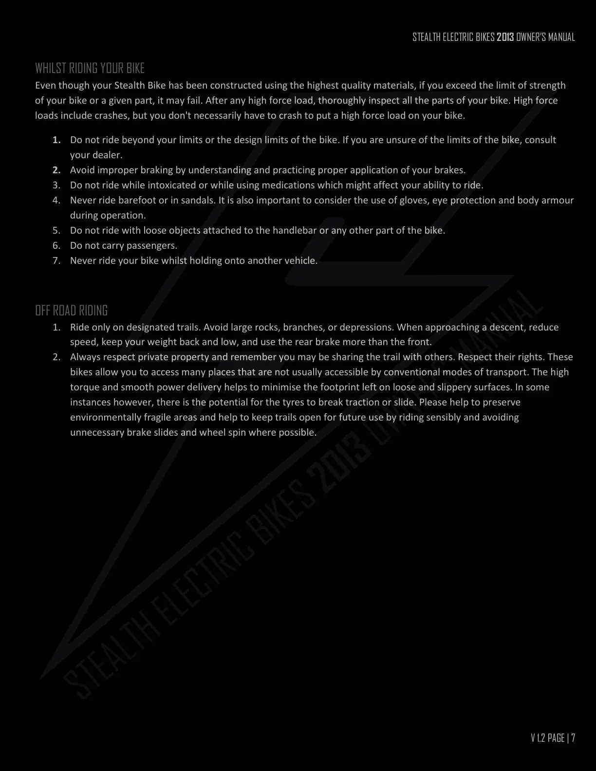 STEALTH ELECTRIC BIKES 2013 OWNER’S MANUAL