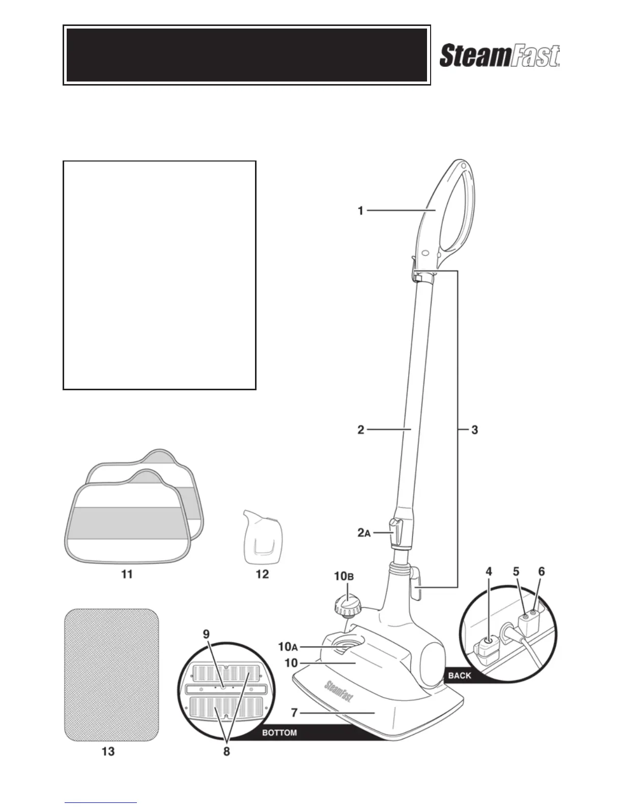 The following features and accessories are included with your Steam Mop. Carefully inspect the