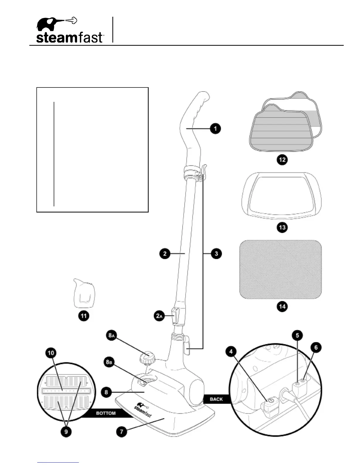 The following features and accessories are included with your Steam Mop. Carefully inspect