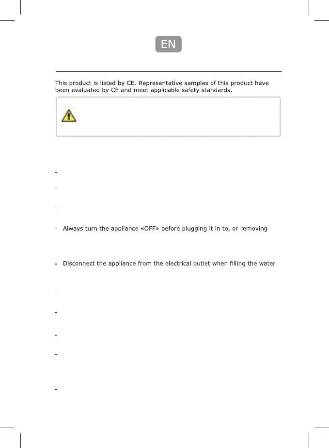 tank, emptying or when not in use. Fill only the water tank with water; do