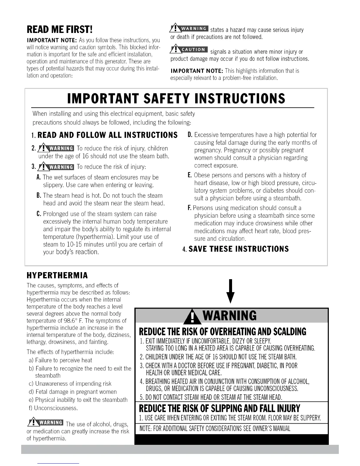 SteamSpa 10.5KW - Steam Generator Safety and Precautions; General Safety Instructions; Hyperthermia Risks and Prevention; Overheating and Scalding Prevention