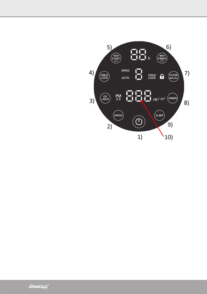 ∙ For at starte UVC lyset tryk på knappen 3). Knappen lyser op, lyset slukkes ved at