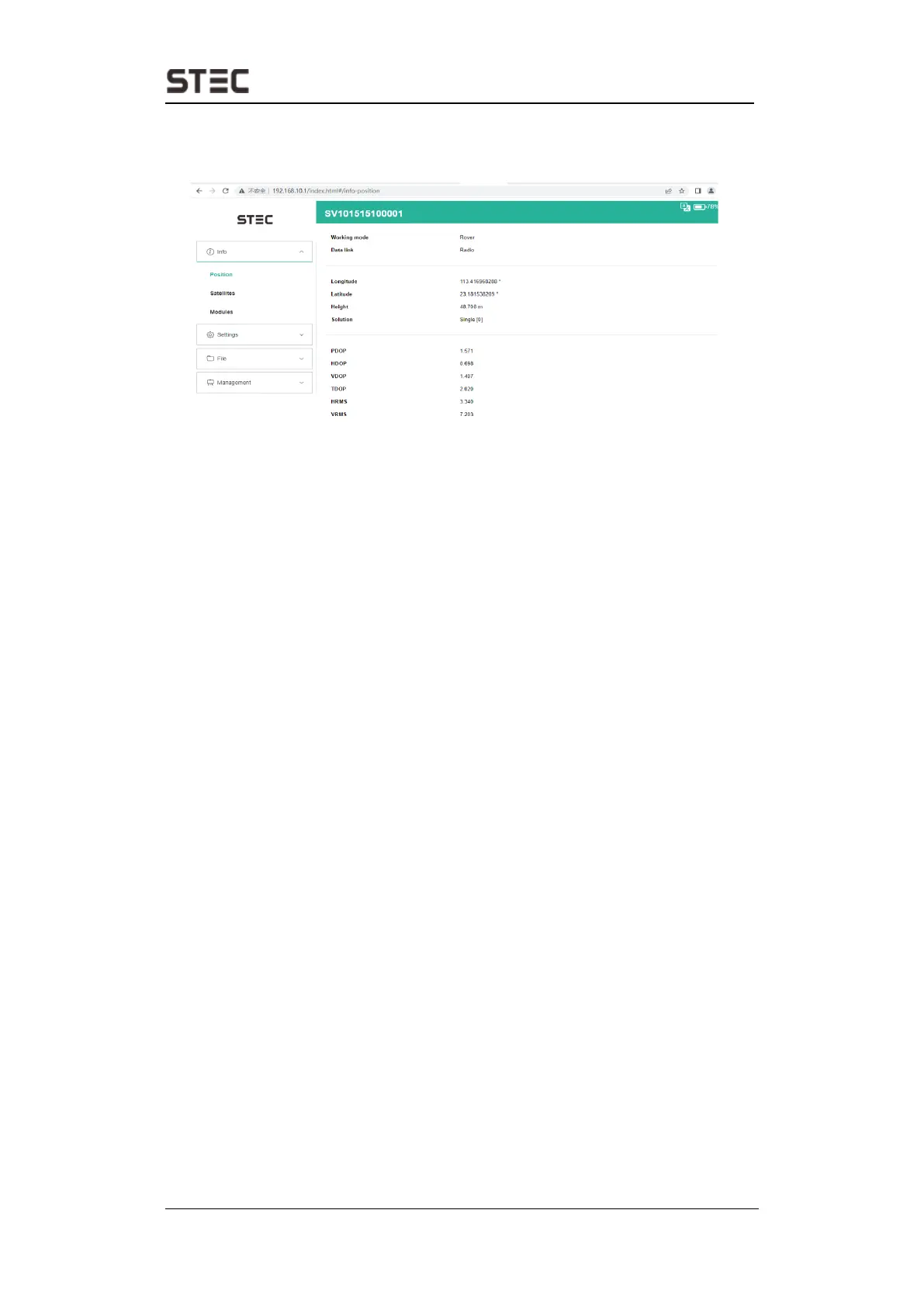 View basic position information, satellite number, PDOP and time. In static mode, can