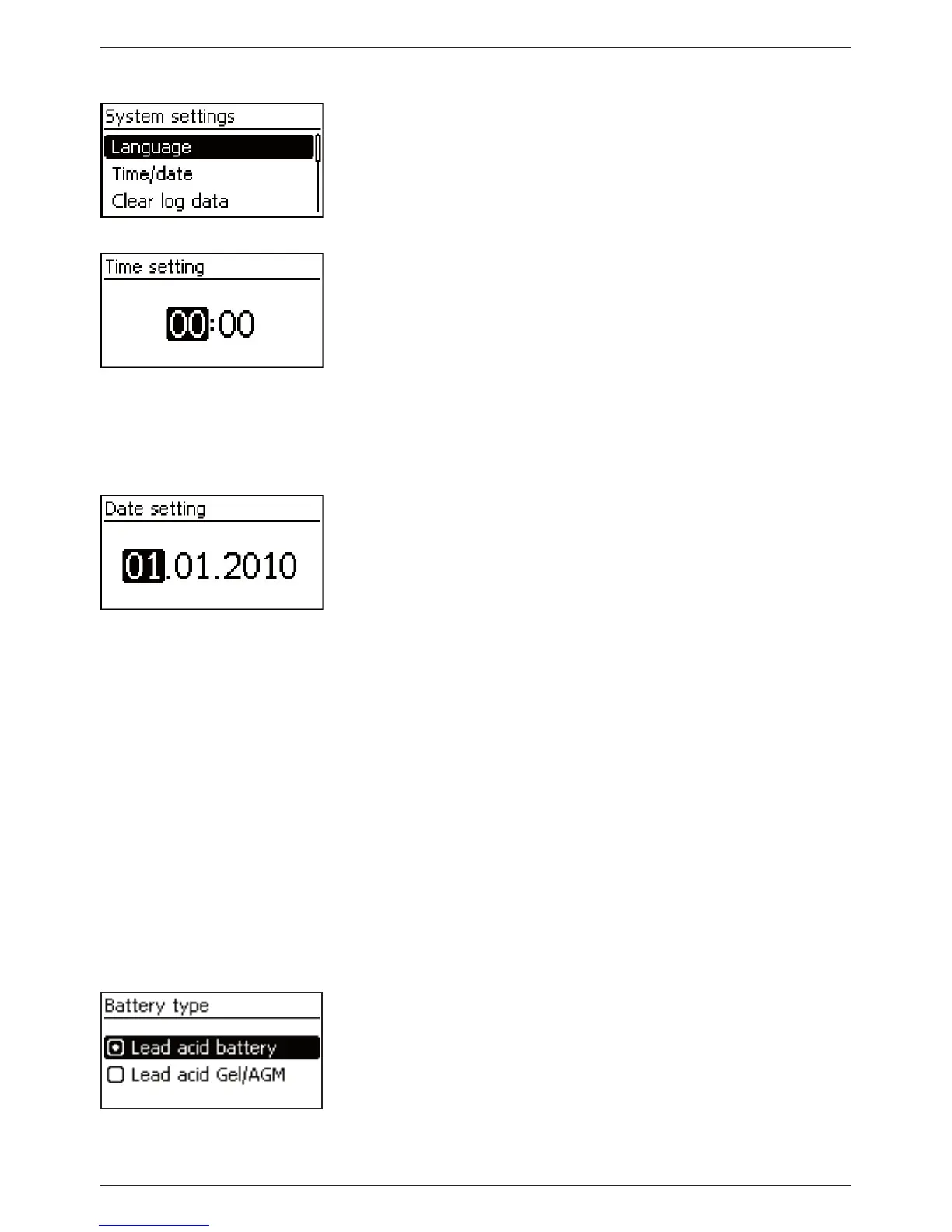 4. Press ‘SET’. The ‘Battery settings’ menu appears.