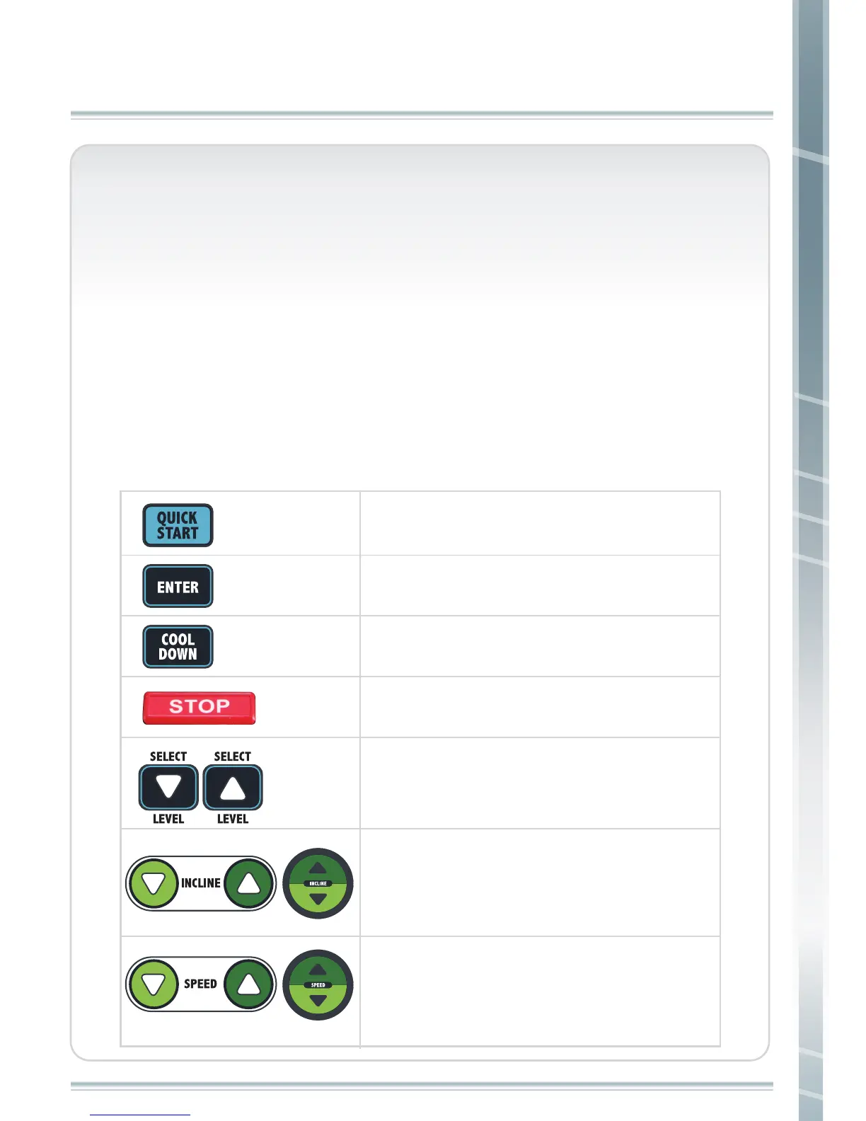 level, and adjusting exercise speed. A description of each button