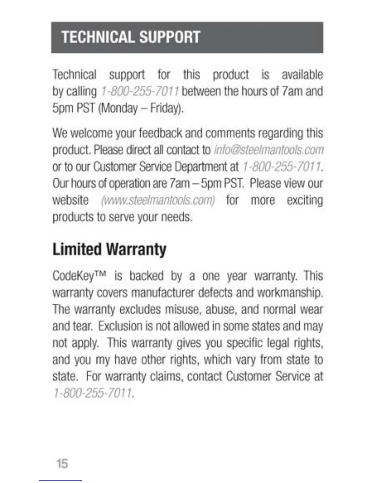 Steelman Codekey - Technical Support Contact; Limited Warranty Details