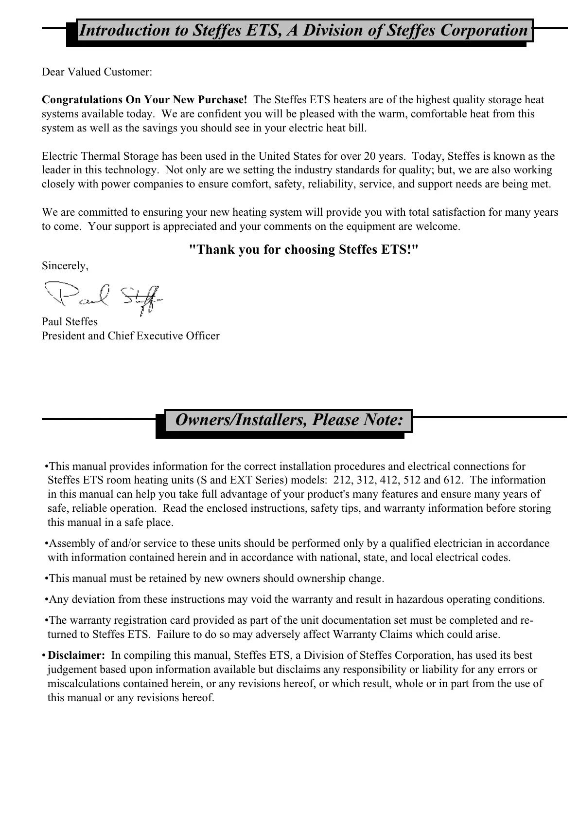 Congratulations On Your New Purchase! The Steffes ETS heaters are of the highest quality storage heat