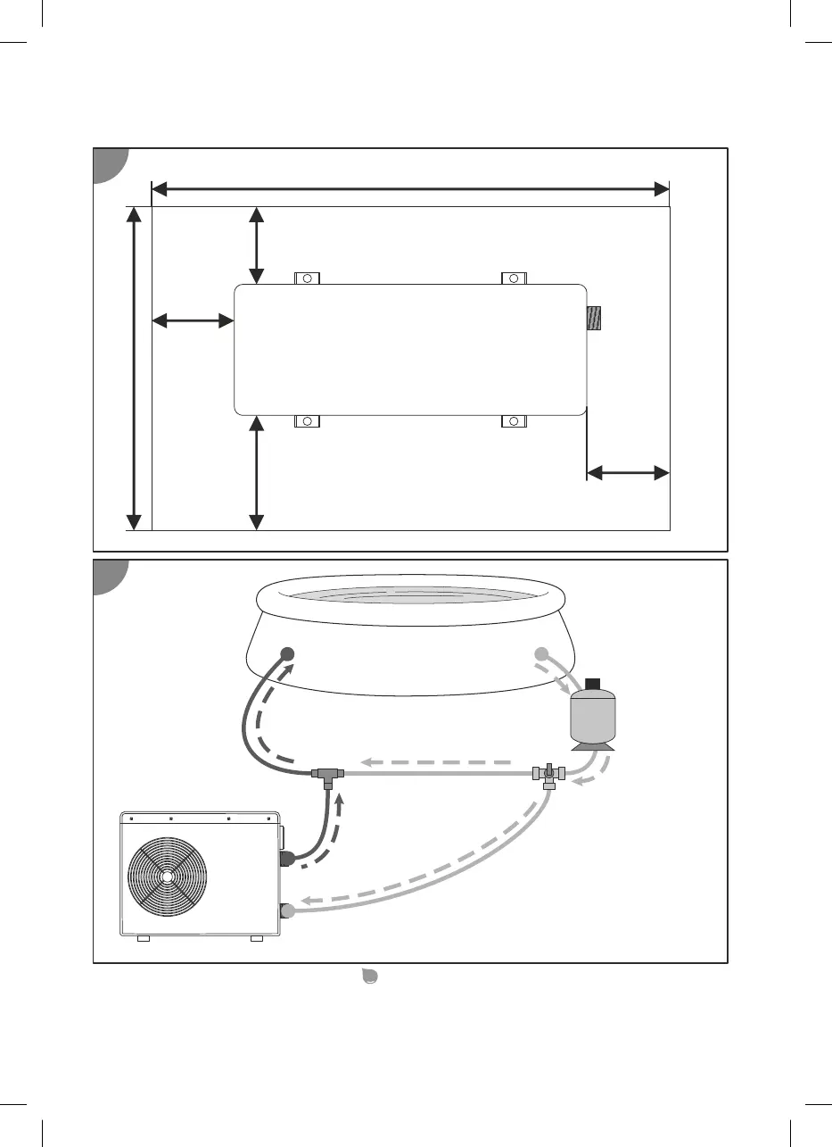 2. Vezesse a csővezetékeket a vízkezelő rendszertől a hőszivattyú felállítási helyéhez (lásd E. ábra).