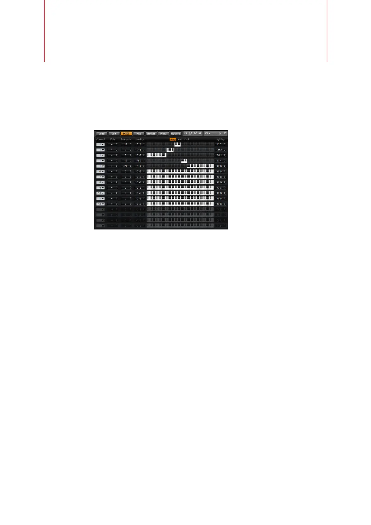 comprises the MIDI channel, Key and Velocity ranges as well as Transpose and