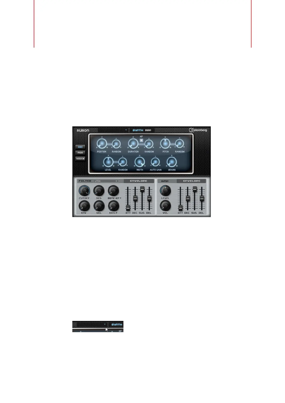 Der Granularsynthesizer beinhaltet drei Seiten: Osc, Mod und Voice. Um eine Seite zu