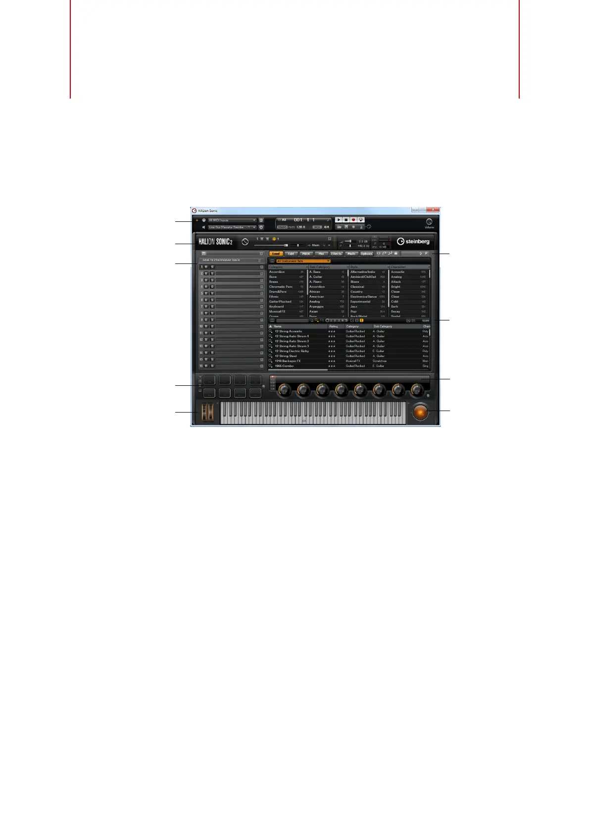L’interface de HALion Sonic se présente dans une fenêtre de taille fixe qui est divisée