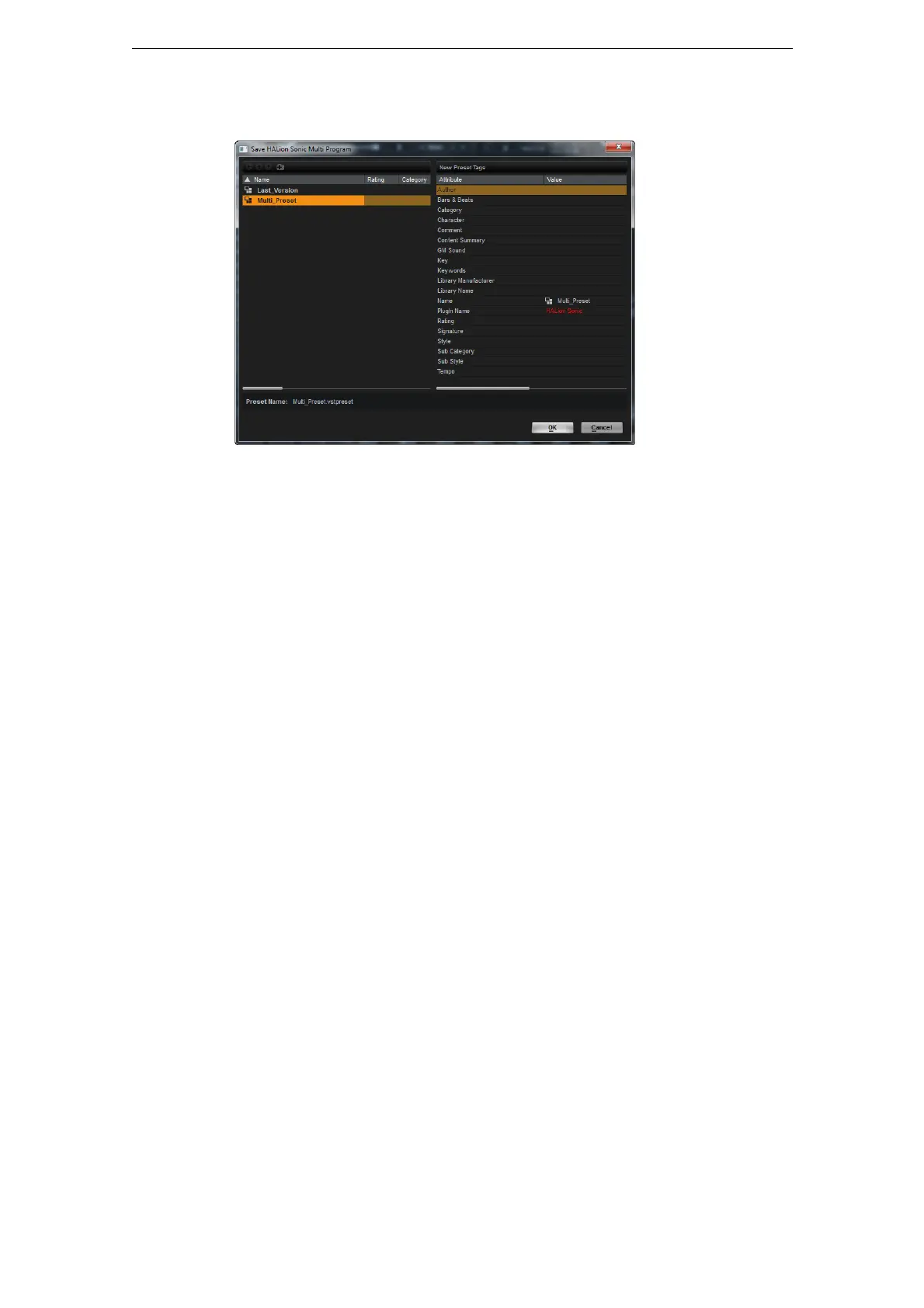 「SaveMulti-Program」ダイアログの右の「NewPresetTags」セクションで、プリセットに割り当て