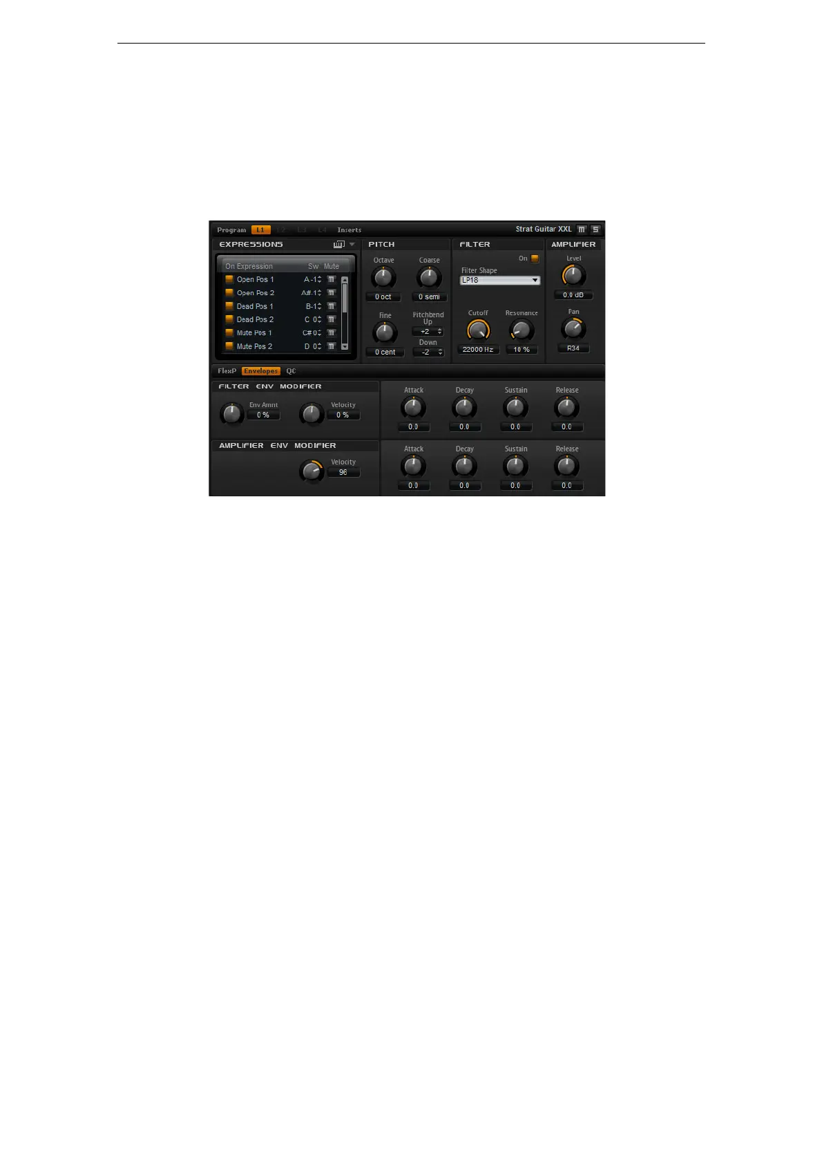 ションのピッチ、フィルター、およびアンプリファイヤーの設定があります。
