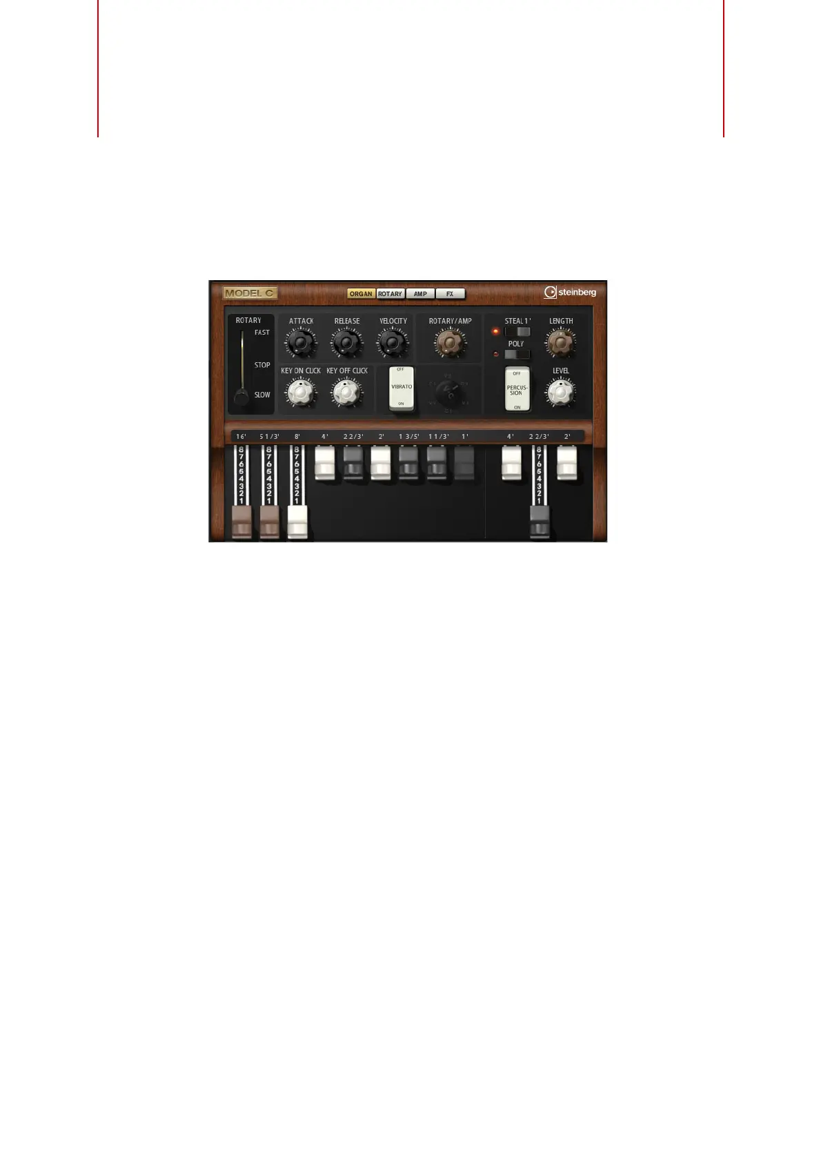 ModelCには、「ORGAN」、「ROTARY」、「AMP」、および「FX」の4つのページがあります。ページを