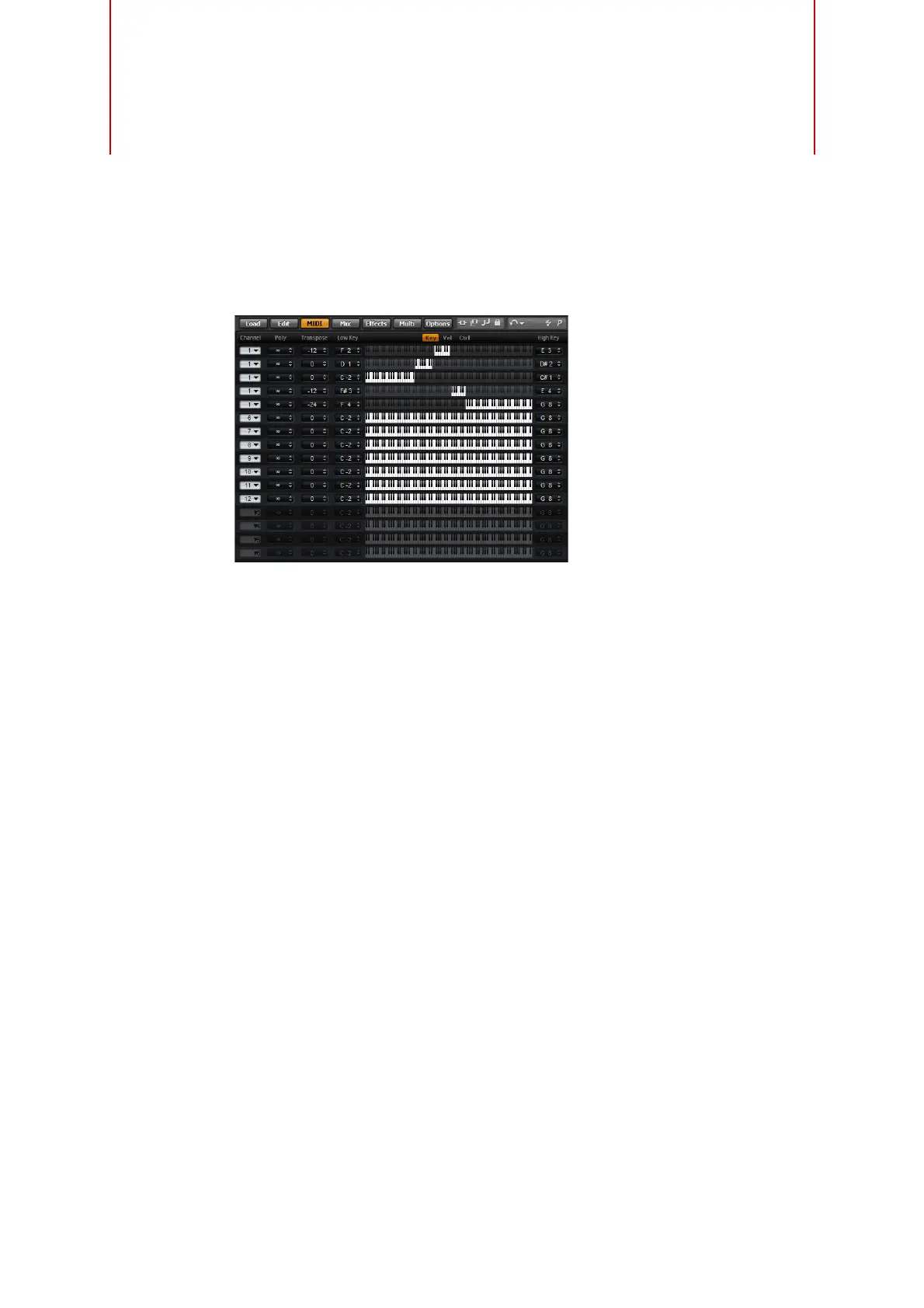ベロシティーとキーの範囲を切り換えるには、範囲コントロールの上の「Key/Vel」スイッチを使用し