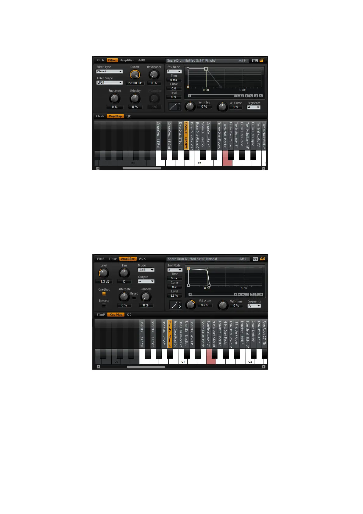 The Amplifier subpage gives you access to the level and pan settings of the drum