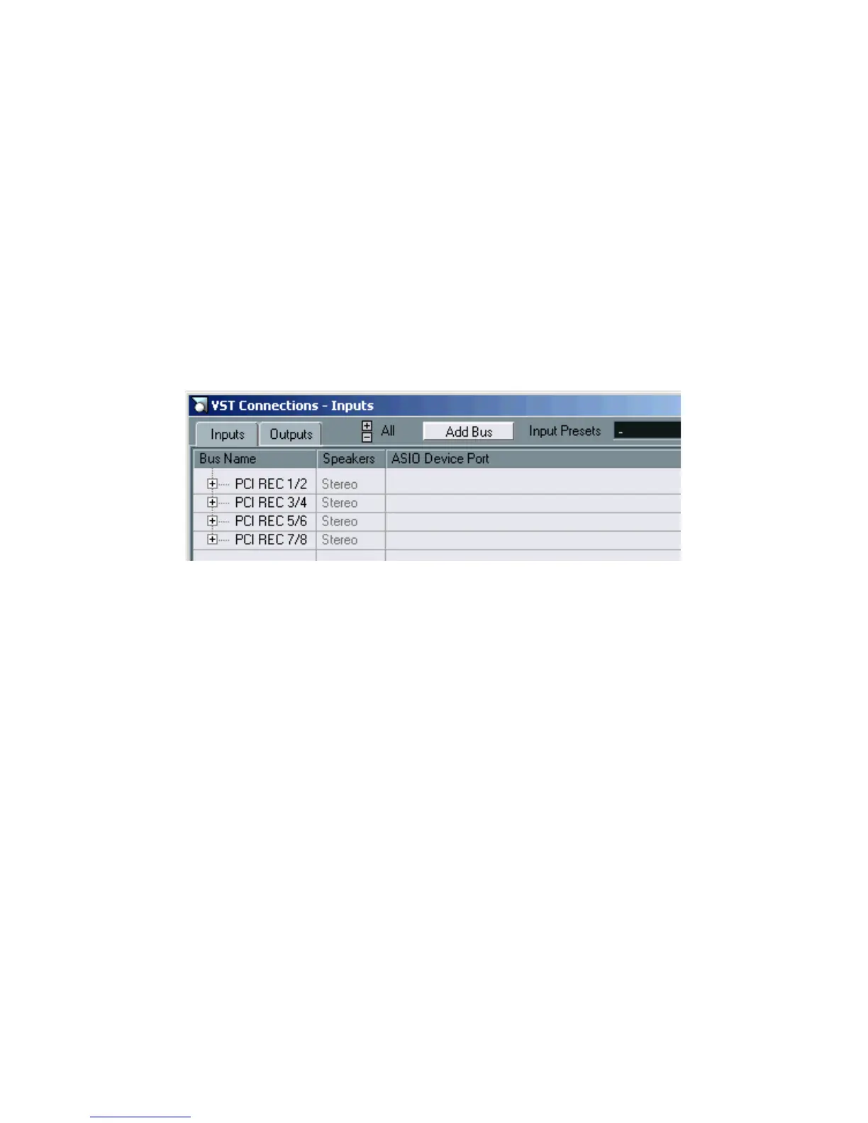 The ASIO Device Port column shows the physical inputs that are used by the bus.