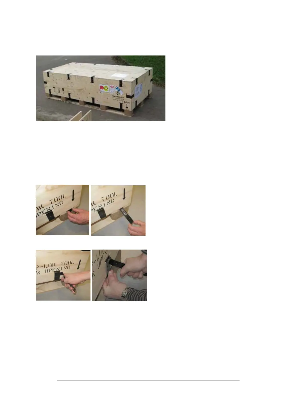 The crates have been assembled using the Clip-Lok packaging system. The clips must be removed with the tool