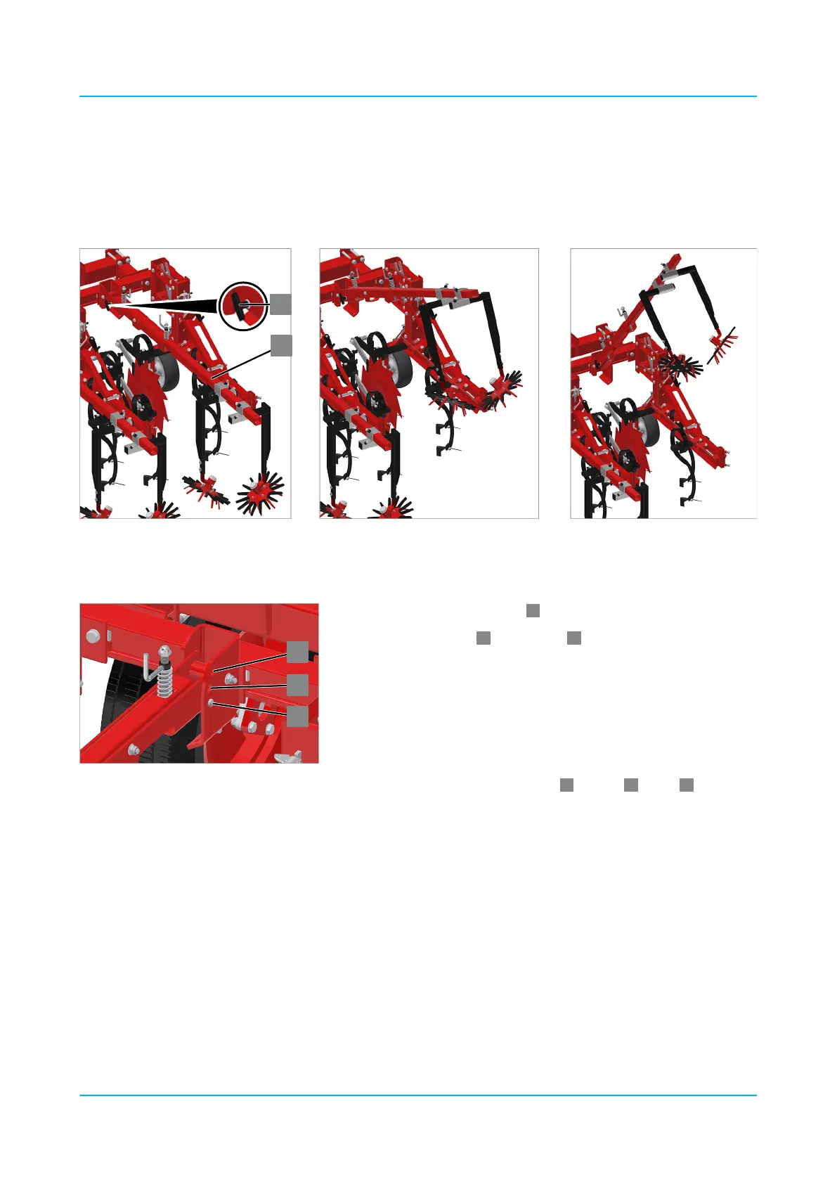 Left: Finger weeder arm in operating position. Middle: Arm raised to middle position. Right: Arm raised to top position.