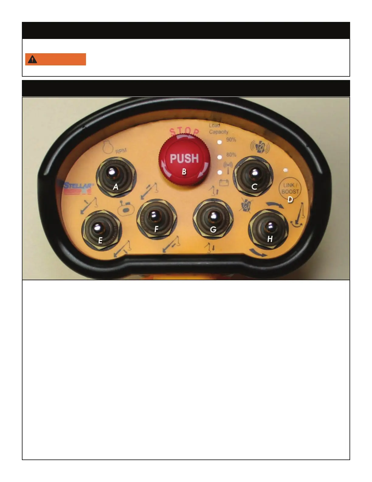 B. E-Stop Button: Push to immediately stop all crane functionality. Note: The E-stop button is not