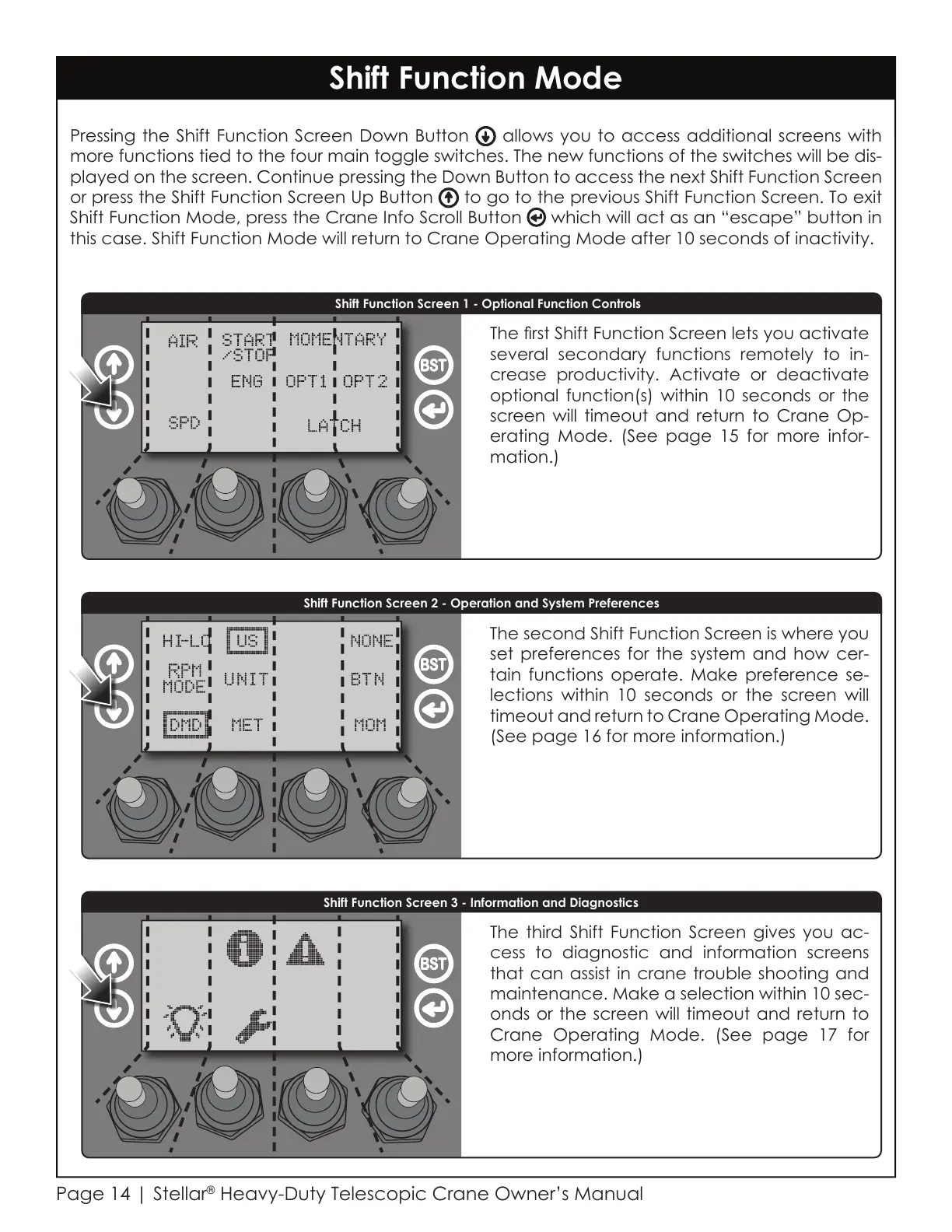 this case. Shift Function Mode will return to Crane Operating Mode after 10 seconds of inactivity.