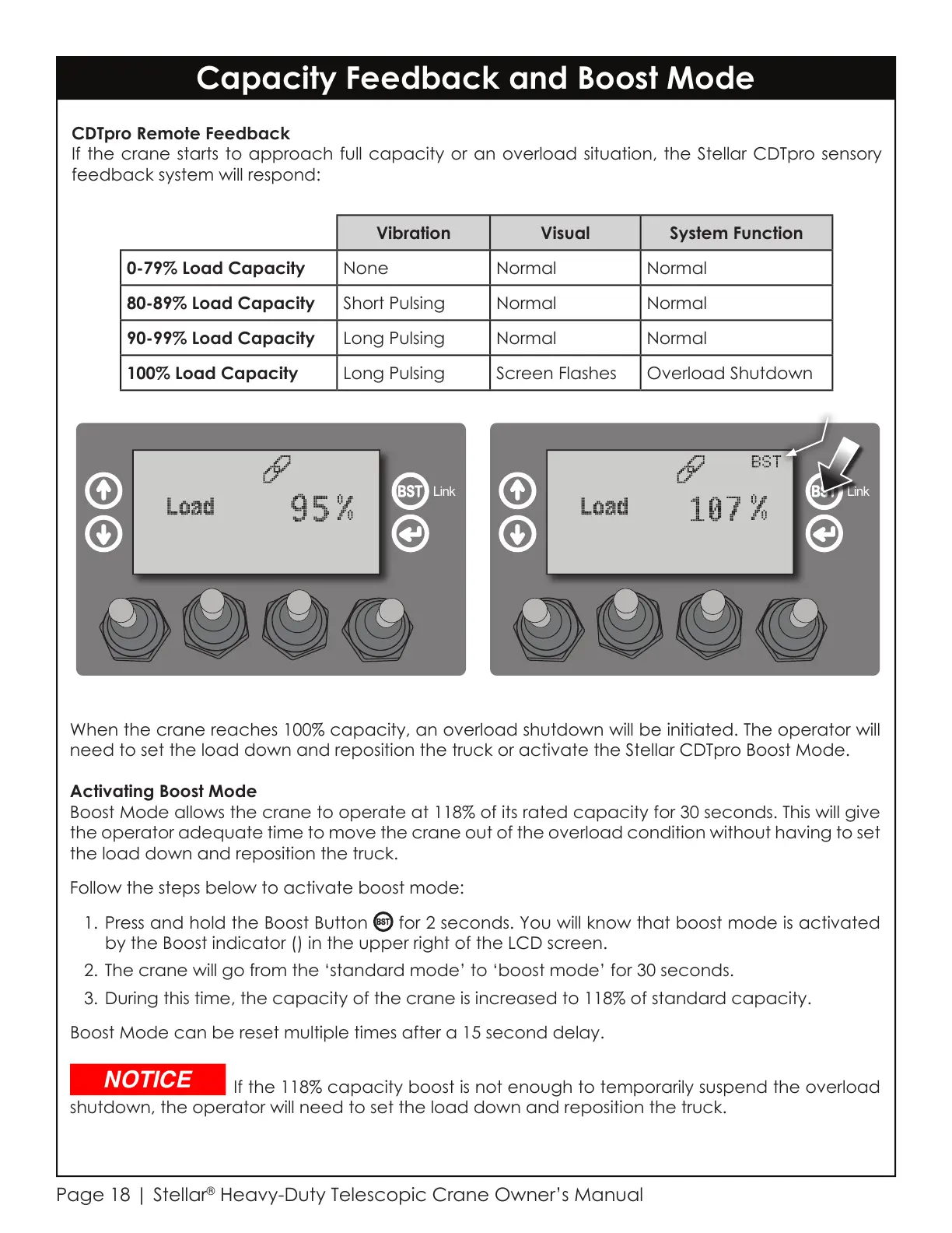 Boost Mode allows the crane to operate at 118% of its rated capacity for 30 seconds. This will give