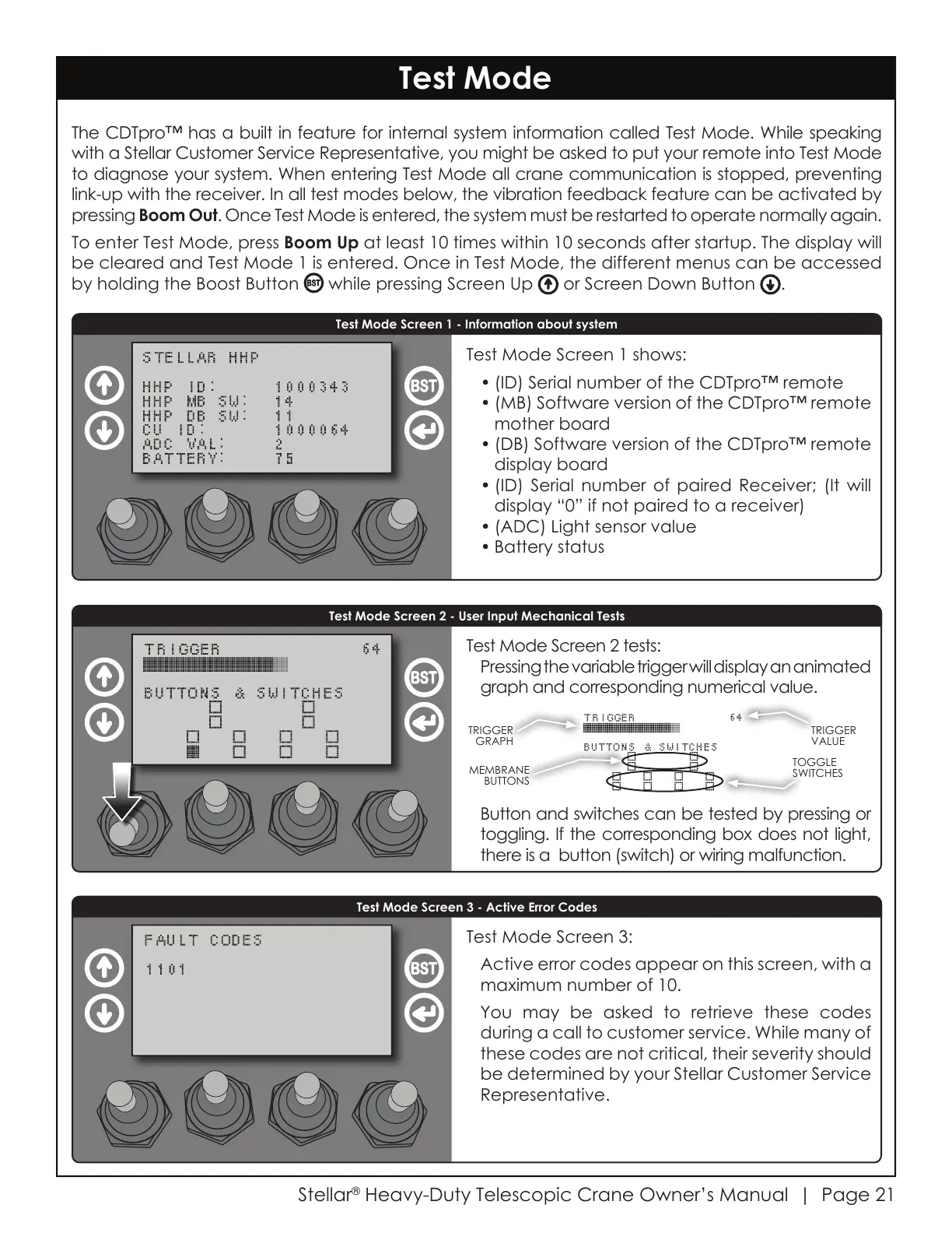 to diagnose your system. When entering Test Mode all crane communication is stopped, preventing