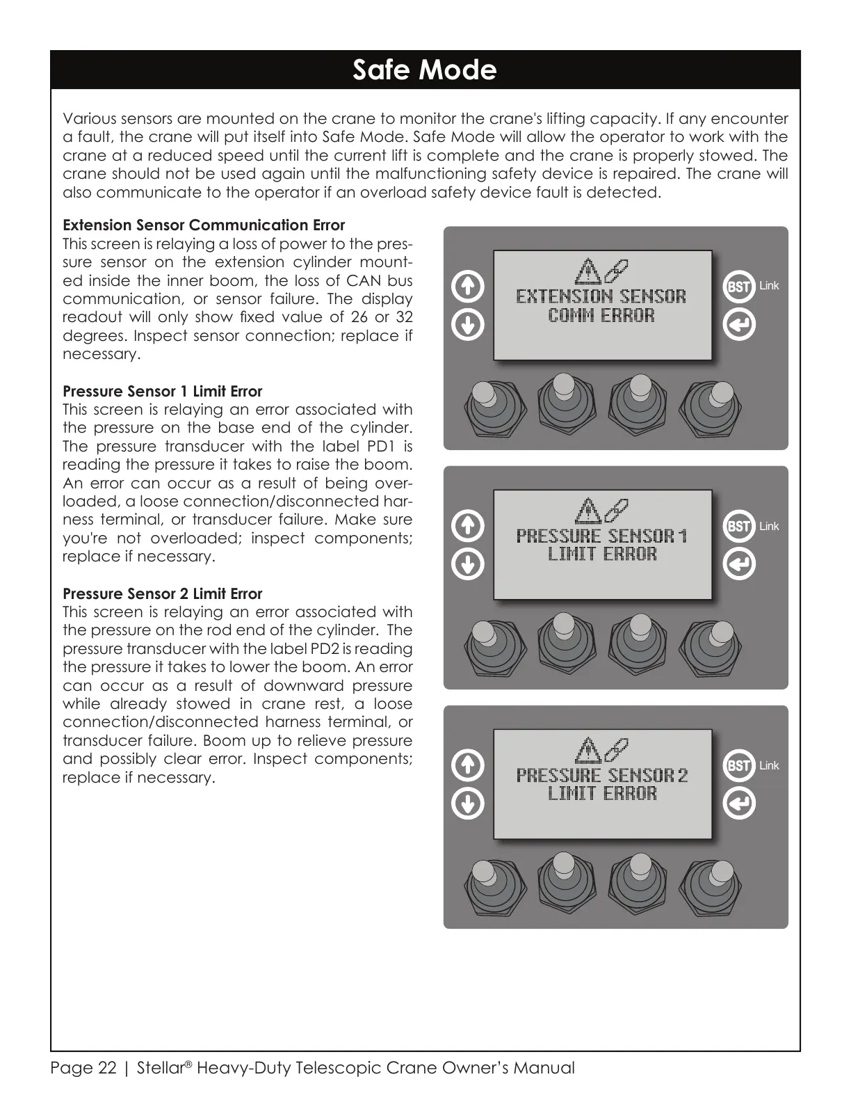 a fault, the crane will put itself into Safe Mode. Safe Mode will allow the operator to work with the