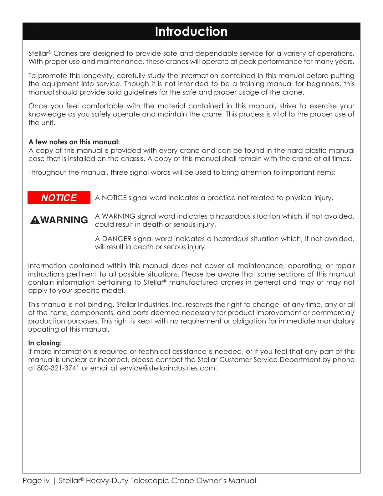 This manual is not binding. Stellar Industries, Inc. reserves the right to change, at any time, any or all