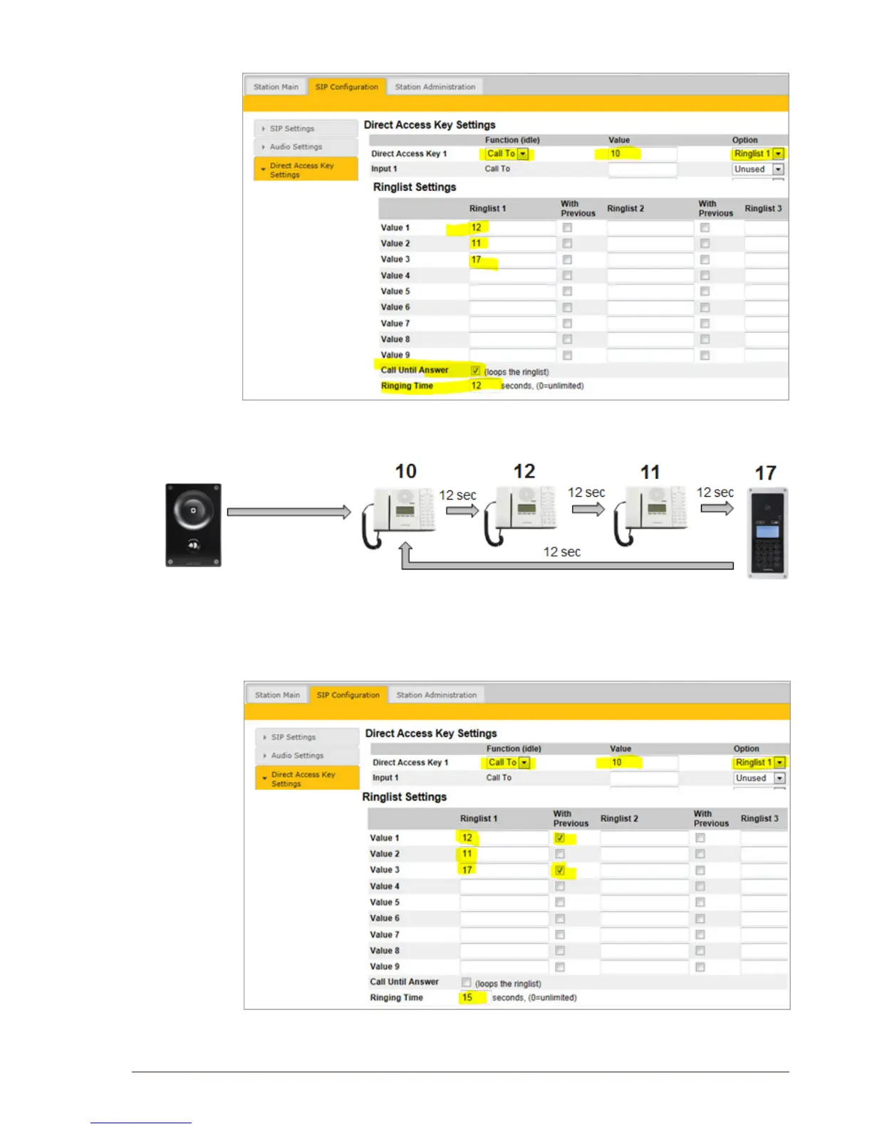 Stentofon Pulse - Ringlist with Loopback; Ringlist with Previous Station