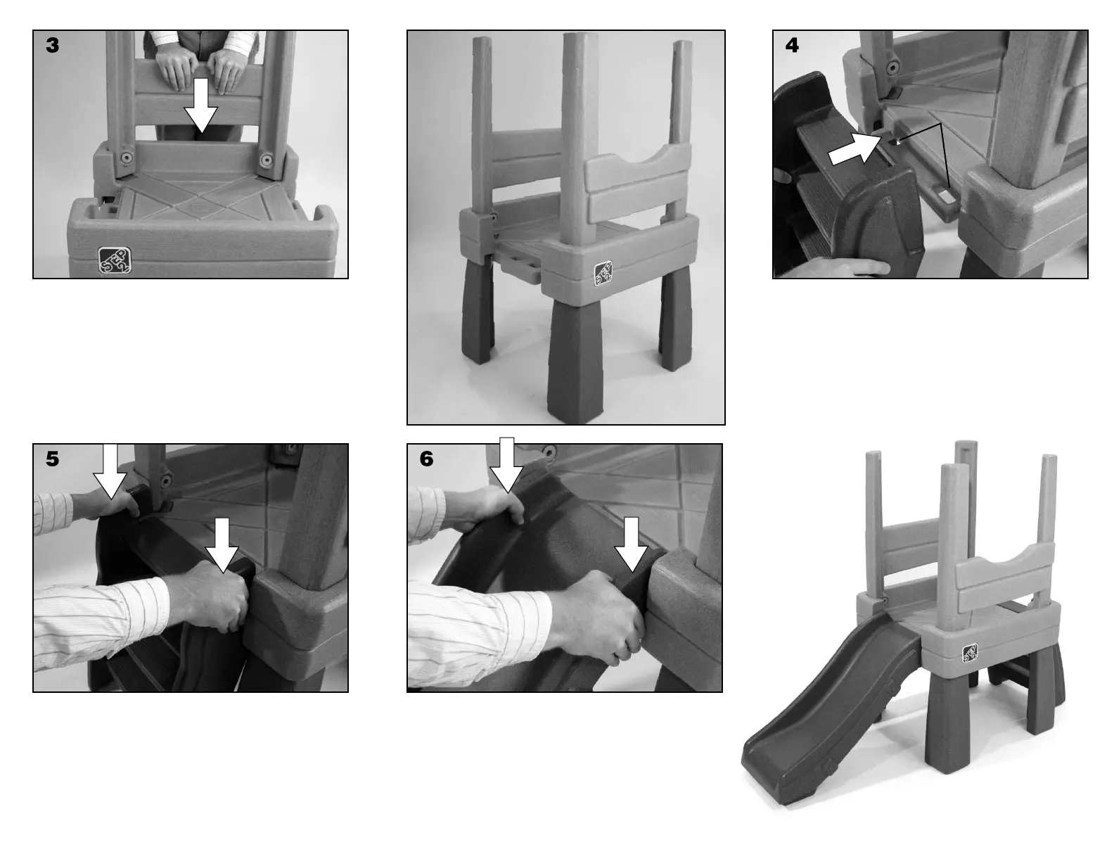 Coloque el tobogán (D) en el lado opuesto de la escalera