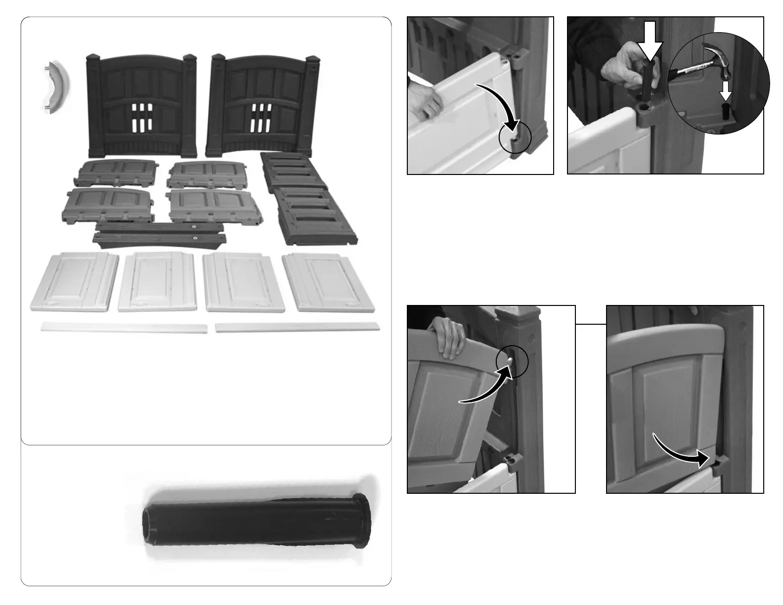 Slide the right side panel (B) into place with the locking peg facing up. Repeat on other side with a left side panel (A).