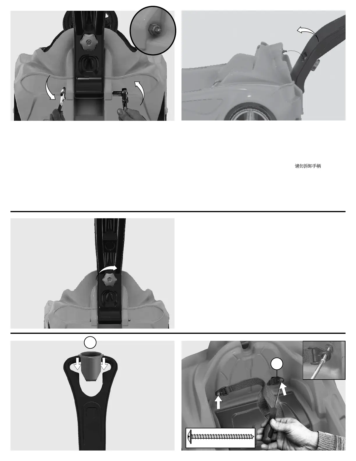 红色按钮应始终保持安装在手柄处。不要移动。如果拔出,请重新安装并置入手柄